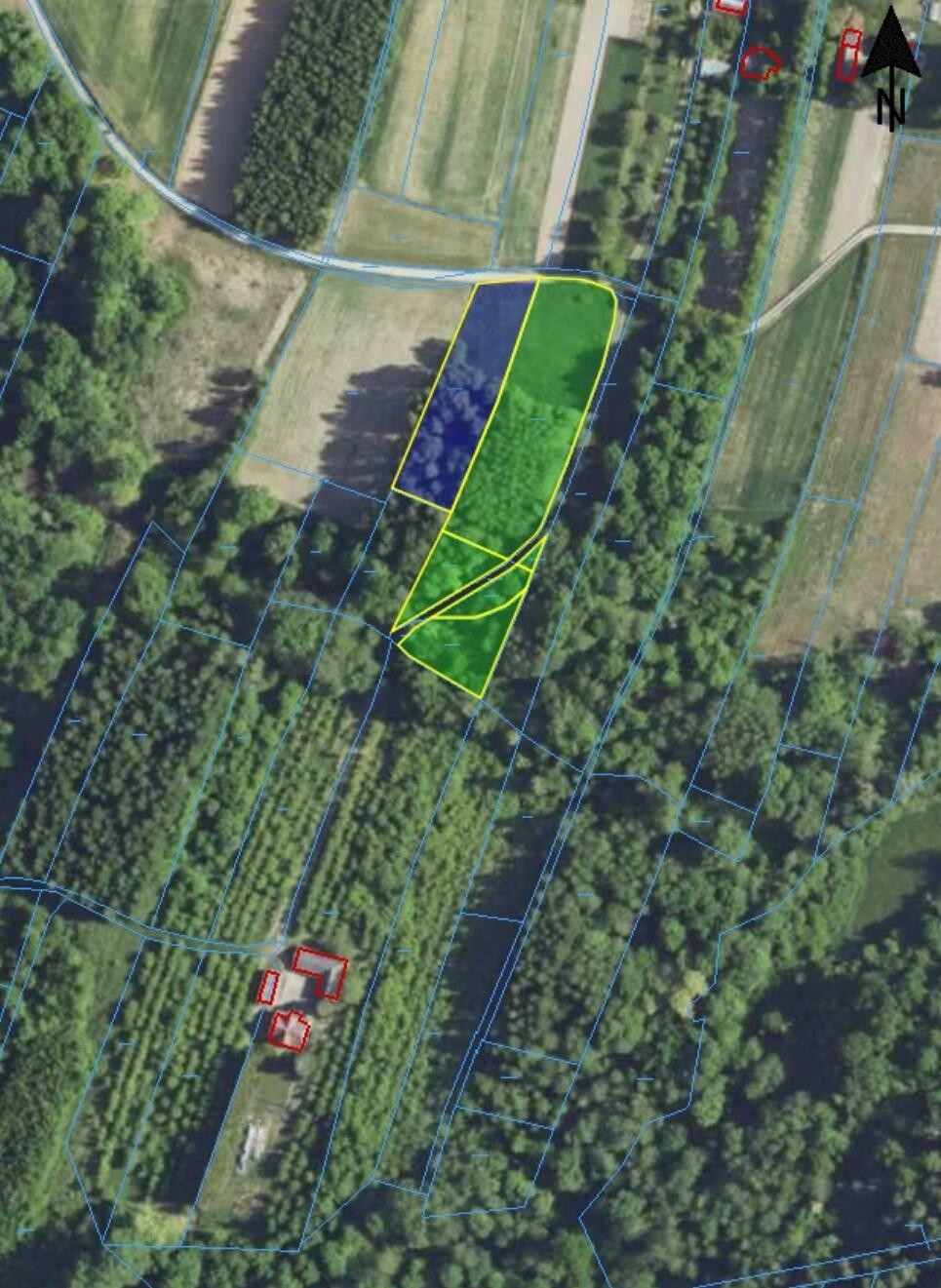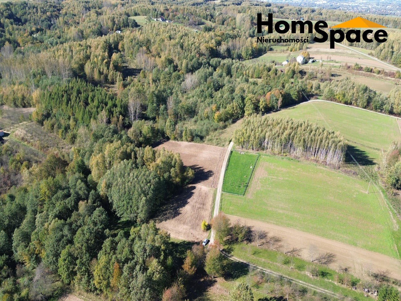 Teren: częściowo zalesiony, od południowej strony przez las przebiega droga przecinająca fragmenty działek
